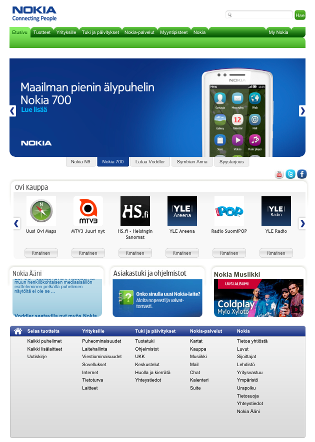 Before the infamous Windows Phones, there was no part of Nokia’s site that I didn’t have a hand in. The eco-guarantee of Nokia’s chargers? The side image of a red 5800 XpressMusic? The top 30 songs on Nokia Music? I made sure all the content was in the right place serving its purpose. At Wunderman Helsinki I was the main digital producer behind the website, the mobile site and Nokia’s online store. I managed a dev team over Jira to keep the site up to date. The Finnish web copy was also my responsibility.